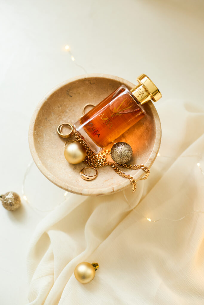 Tijdens de shoot heb ik zowel product‑ als lifestylebeelden gemaakt: van close‑ups van parfumflesjes met glinsterende accenten tot warme settings waarin modellen de geuren gebruiken in gezellige winter‑interieurs. De combinatie van zachte belichting, stijlvolle kerstprops en subtiele feestelijke elementen creëert een moderne, elegante kerstsfeer die past bij het merk zonder cliché te worden.